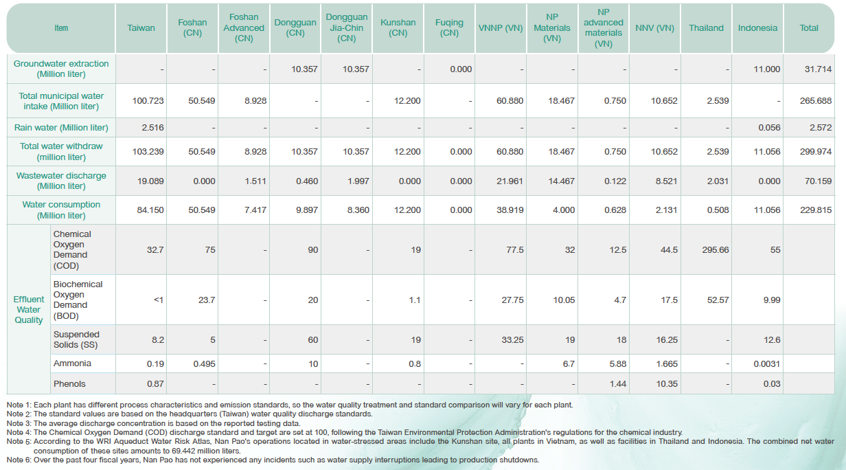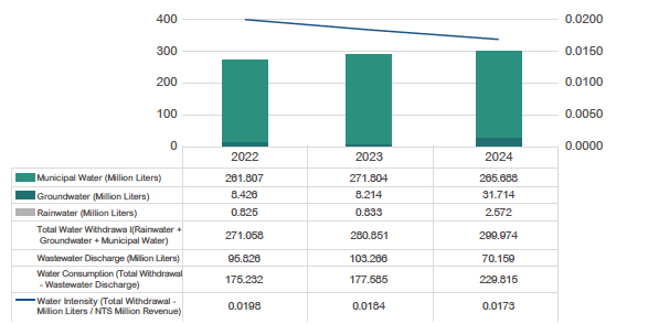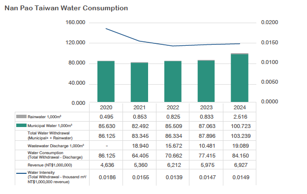 In 2024, Nan Pao Taiwan recorded a total water withdrawal of 103.239 thousand cubic meters, an increase of 15.343 thousand cubic meters or 17.46% compared with 2023. Although annual revenue also grew during the same period, water intensity rose slightly by 1.36%, failing to meet the originally set annual target.
