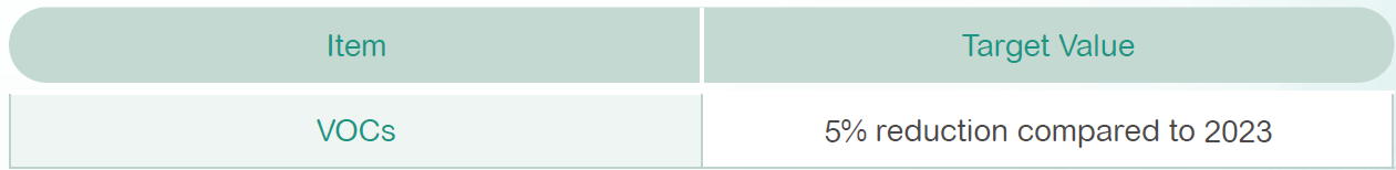 Considering variations in production volume and product pricing, the Group achieved significant improvements in 2024 but will continue to adopt a prudent advancement strategy in 2025. A new target has been set to reduce VOC emission intensity by 10% compared with 2023, with ongoing efforts to strengthen process management and pollution control to minimize environmental impact.