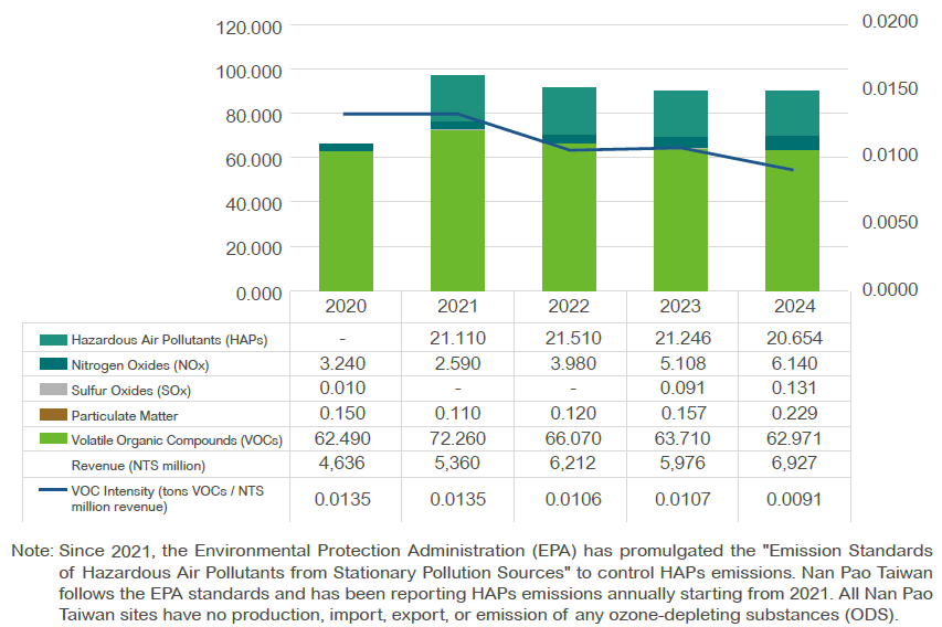 In 2024, Nan Pao Taiwan recorded volatile organic compounds (VOCs) emissions of 62.971 metric tons, a reduction of 0.739 metric tons (-1.16%) compared with 2023. The VOC intensity was 0.0091, representing a 14.95% decrease year-on-year. This reduction was primarily attributable to the Company's adoption of the regulatory authority's recommendation in 2024 to exclude externally purchased raw materials from the calculation of input quantities, thereby lowering the estimated VOC emissions.