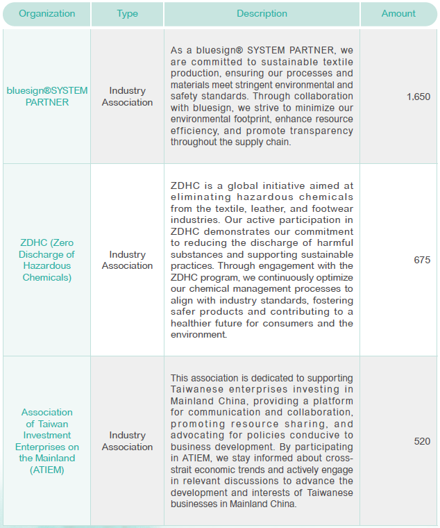 Membership in public and industry associations is first reviewed by senior management of each business unit, and then submitted to the General Manager for approval. The Corporate Sustainability Task Force regularly evaluates whether participation aligns with Nan Pao's sustainability goals and policies, reporting results to the General Manager.
