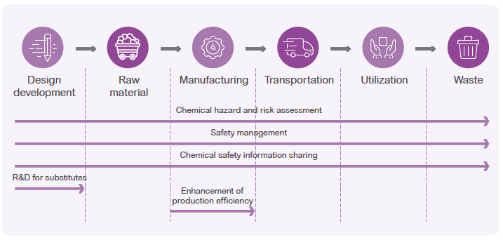At the facility level, the R&D, Quality Control, and Occupational Safety and Health departments at the headquarters and each production site serve as the core units for chemical management. A "Chemical Management Procedure" has been established to guide management across all stages of the chemical life cycle. This procedure starts with source control and extends to management during the introduction phase, with focused monitoring during on-site use.