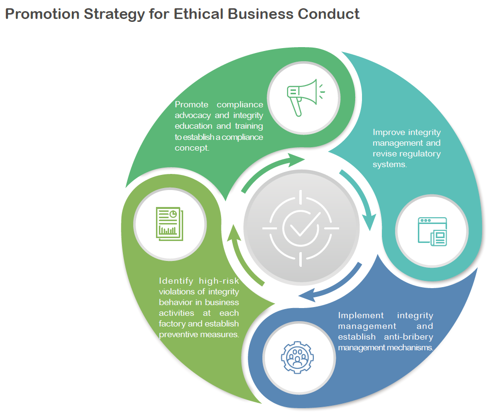 The Code of Ethical Conduct reflects the Company’s mission, vision, and values. The Company has long upheld the principles of integrity in business operations, complied with applicable laws and regulations, implemented sound corporate governance, and fulfilled its corporate social responsibilities. Employees are required to comply with the "Code of Ethical Conduct" in areas including business ethics, labor relations, health and safety, environmental protection, internal controls, and corporate governance. In addition, the Company has established the "Procedures for Ethical Management and Guidelines for Conduct" as its policy for ethical management. These procedures were most recently amended and approved by the Board of Directors on December 17, 2020; December 18, 2024; and December 18, 2025, respectively. Furthermore, in accordance with the "Ethical Corporate Management Best Practice Principles for TWSE/TPEx Listed Companies" , the Company adopted the "Integrity Management Code" as a higher-level governing regulation to strengthen the internal regulatory framework and enhance internal control systems. The Company has disclosed the "Code of Ethical Conduct", "Procedures for Ethical Management and Guidelines for Conduct", and the "Integrity Management Code" on its corporate website and internal information-sharing platforms.