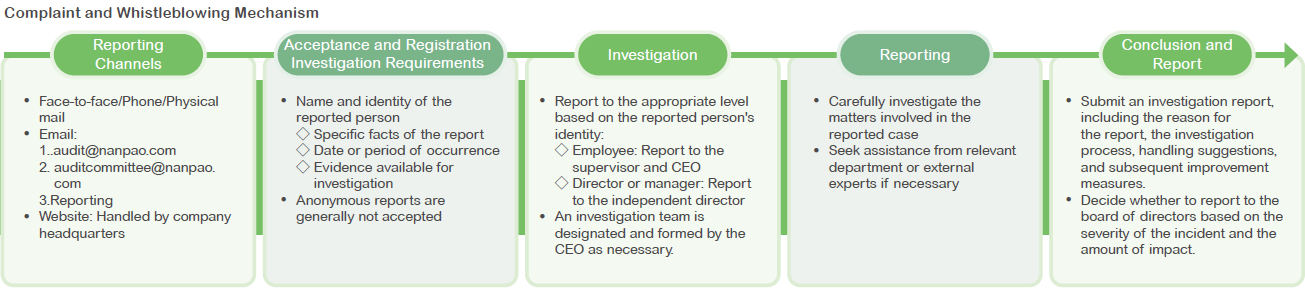 The Company has established a "Regulations Governing Whistle-blowing from Internal and External Parties" and publicly disclosed it on the company's official website and internal information sharing platform. The procedure clearly outlines the receiving units, reporting channels, and processing steps. Additionally, a dedicated communication section for stakeholders is available on the company's website, where stakeholders can use the provided channels to submit suggestions and complaints. Upon receiving feedback, the responsible units conduct investigations and follow-up actions.